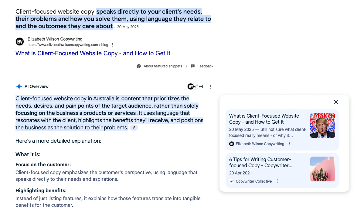 And just to prove all of this works - here’s my blog - What is Client-Focused Website Copy - and How to Get It - showing up at #1 in AI Overviews!